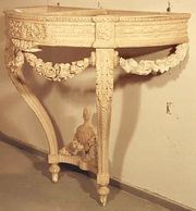 We fabricated and carved the right hand garland for this console. We then painted it to blend with the existing antique white.